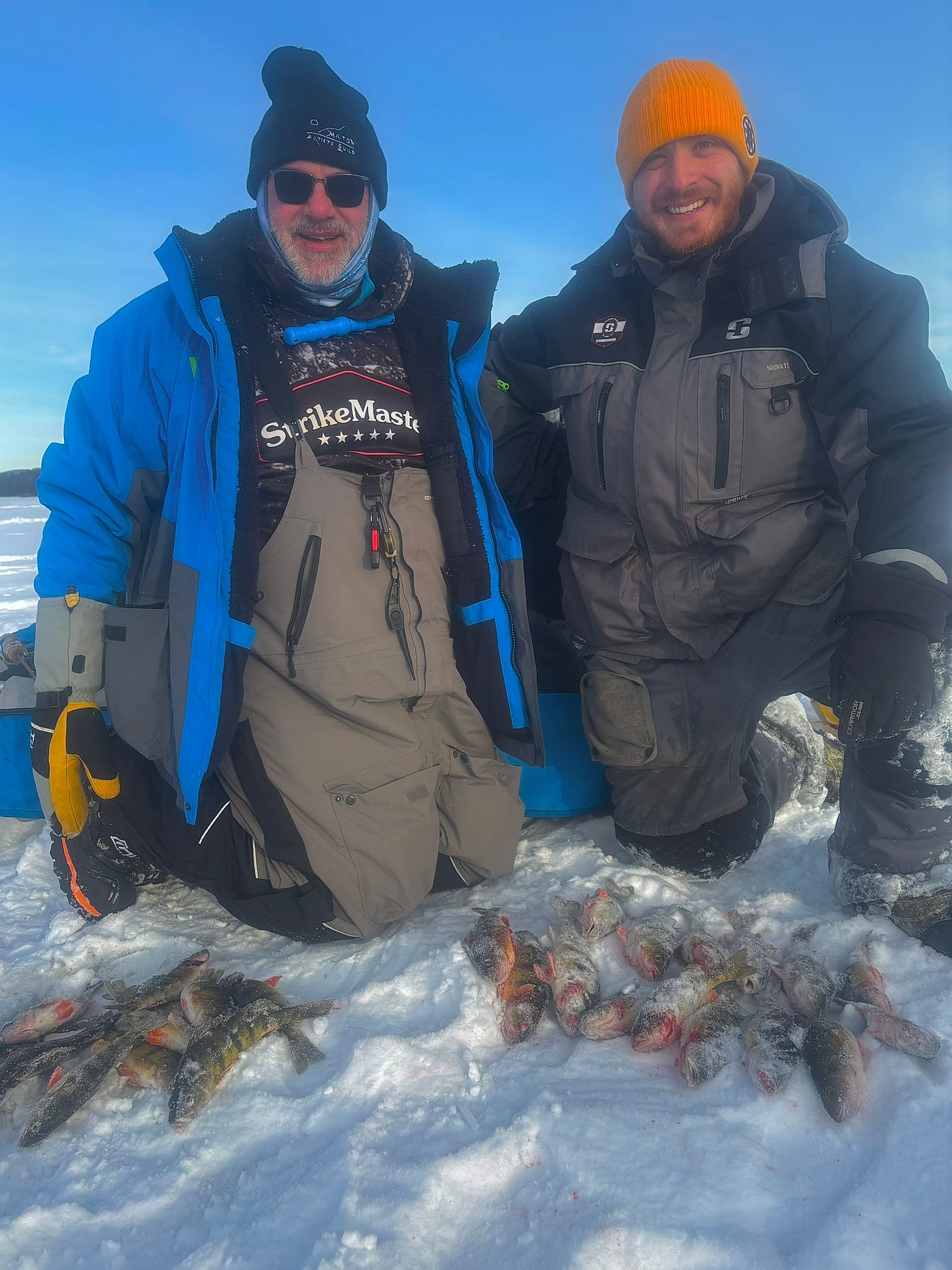 Notably, he was the first on the board with a nice ten-inch yellowbelly. But the rest of them were as finicky as an insolent toddler. We switched bibbits a few times. Christian tried a Maki plastic on a Clam Drop Kick and hooked another nice “fatty.” I put a couple of spikes (maggots for the uninitiated) on my favorite Simcoe bibbit and dropped it down the icy cylinder. It “bounced” off the silty bottom and stirred up a small rainbow cloud on the screen. Seconds after the cloud appeared, the ultra-sensitive tip of my Tickle Stick ice rod bowed down in a dramatic tug toward the hole. The vibration of the fish on the hook made the whole rod thrum. Reeling it up from the bottom, the fish fought hard and twice ran, taking the line from the spool as if the drag didn’t even exist. “Let ‘em run!” Christian said. “Of course!” I replied. “I just don’t want to snap the line. It’s only a three-pounder.” Christian replied, “Let the rod do the work.”