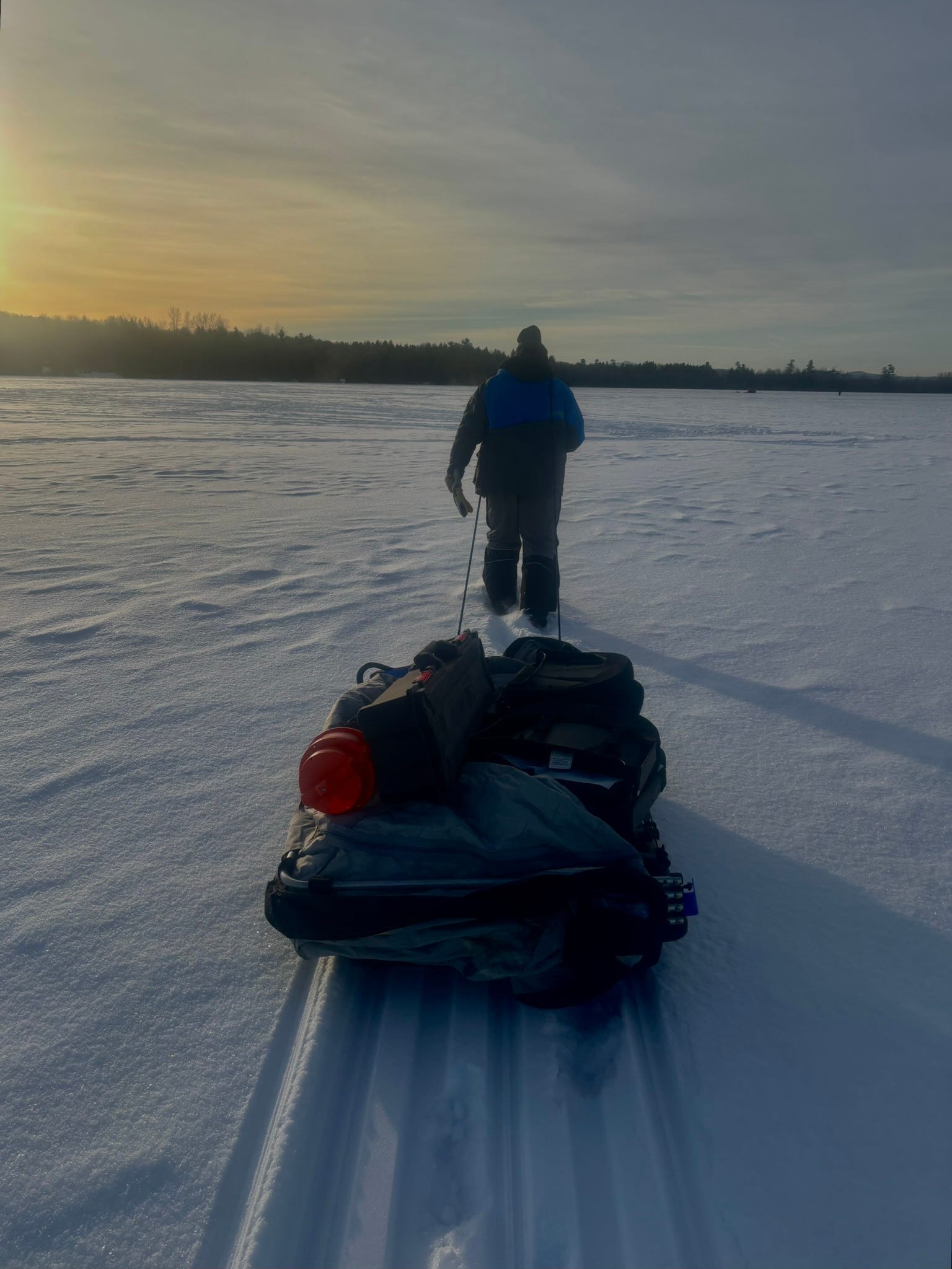 Yesterday was our first day on the ice for the season. It was a 5 am start with an hour-and-a-half drive north, and the first real cold spell dipped the mercury below zero. Stopped for breakfast sandwiches at a truck stop. I was prepared for the worst. The double bacon, egg, cheddar, and tomato with mayo and pepper sauce did not disappoint. Two thermoses of French roast coffee. The first one needed a refill, as the night before had been mostly sleepless.