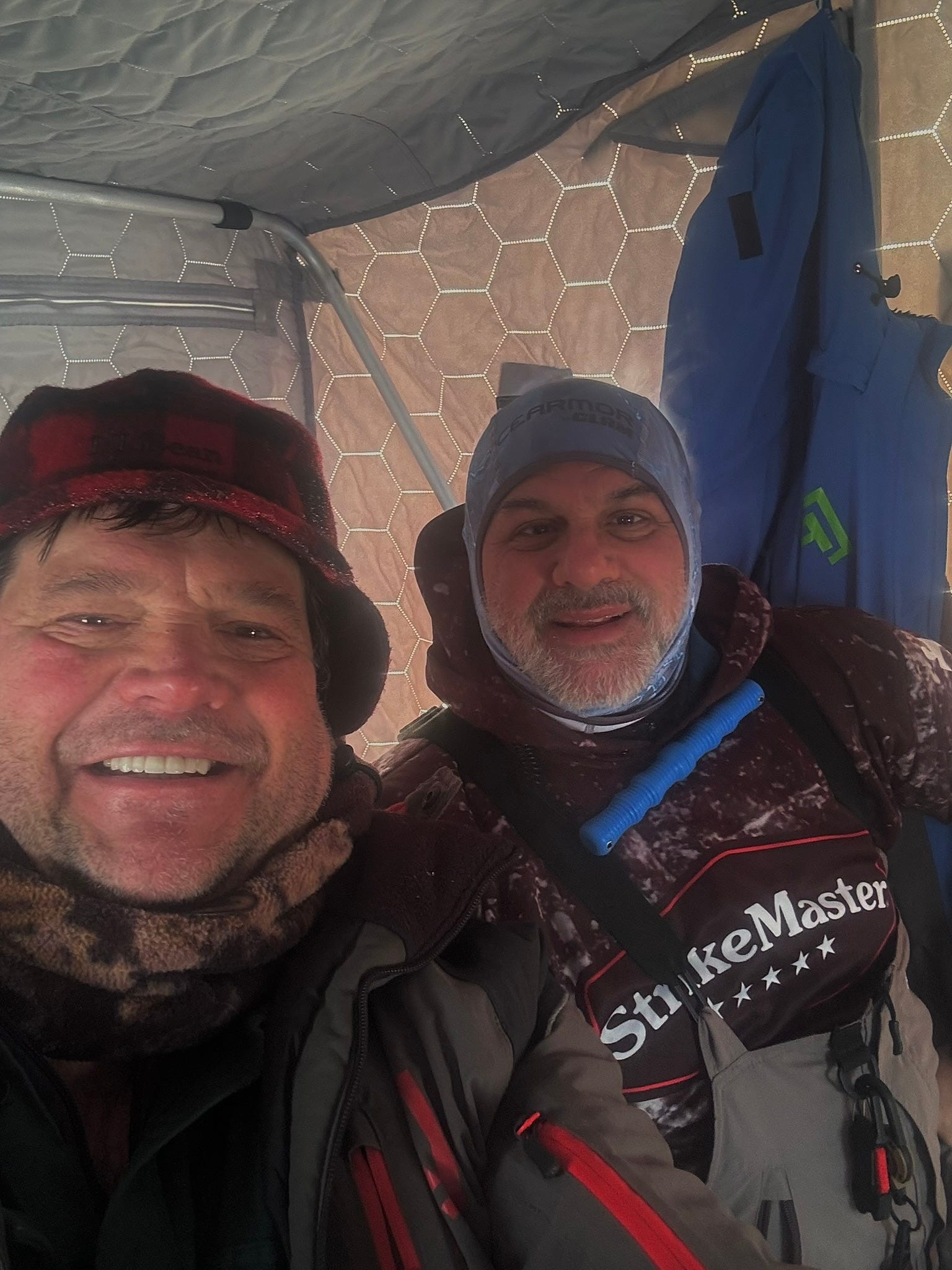 Yesterday, we felt confident dragging our shanties and sleds out to a drop off where the sonar app read from twenty-three feet to thirty. My partner, Christian, is a true Canadian. When these guys are delivered in the hospital, they must be issued a permanent fishing license on their birth certificate, and instead of reaching out for their mother’s breast, I think that they reach for the nearest thing that looks like a fishing rod. They are Born to Fish.