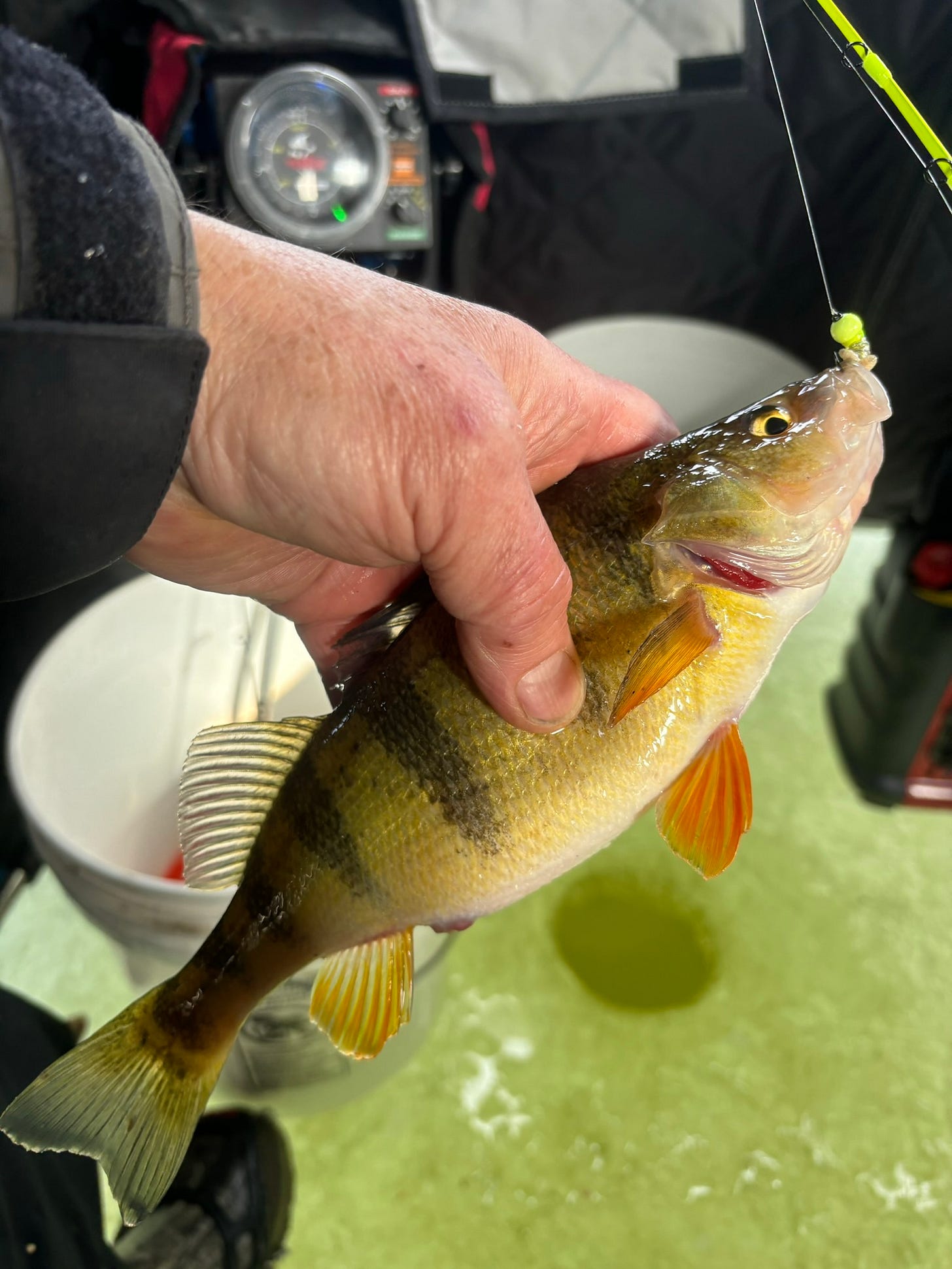 A minute later, I was holding up my first yellow perch of the season. Not a trophy size-wise, but that first fish through the ice gets my blood pumping hard. First ice. First fish, Third to the last day of the year.
