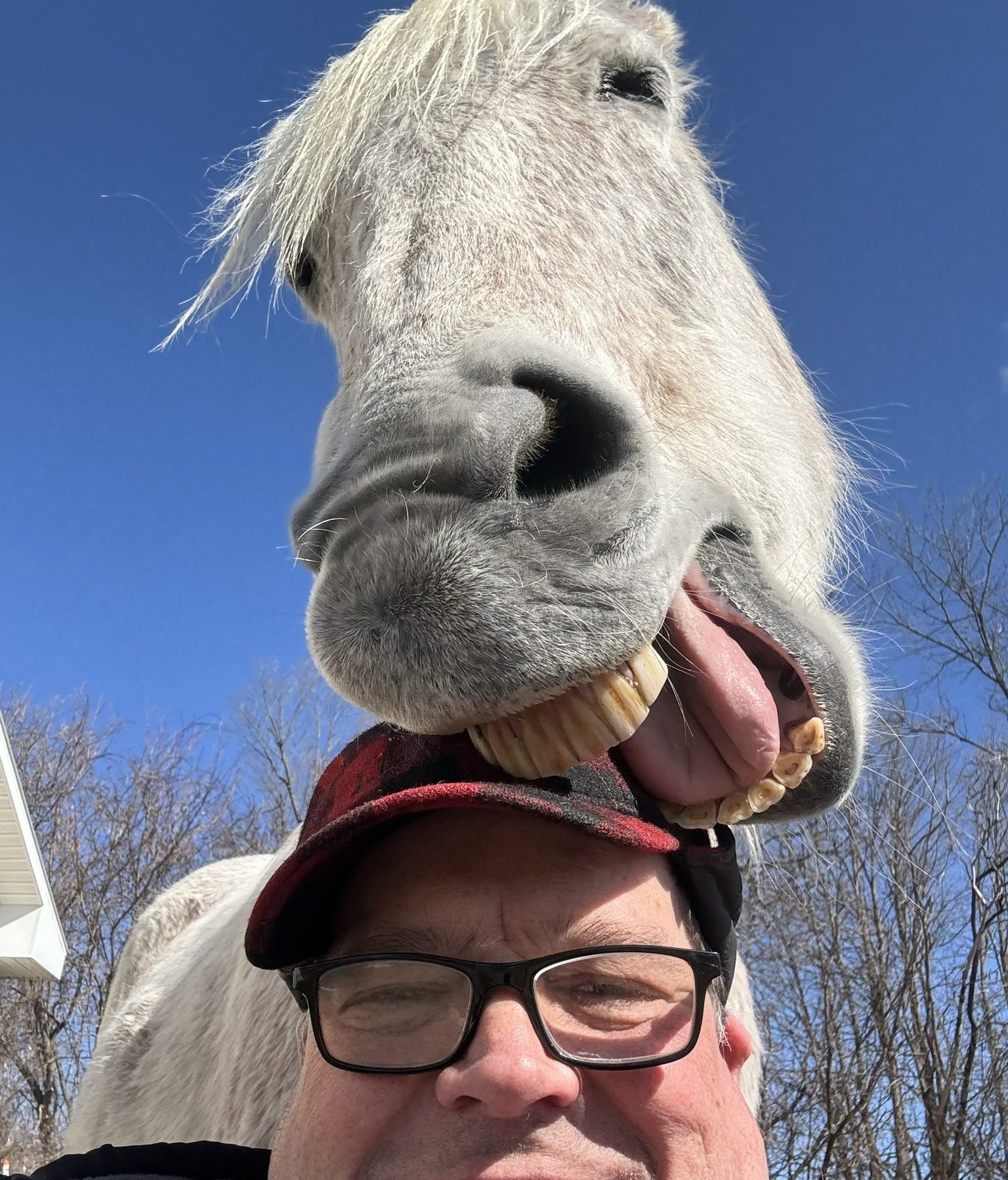 Many times, I wrestle with the idea that I should “be more,” that I am not “enough.” But to sit with this majestic animal, it is clear that the lesson I need to learn is to recognize that, at this moment, I am enough. It is enough to be here. Now. To share this cold winter’s day in the paddock with him. To smell the woodsmoke rising and falling from the chimney. To feel the warmth of his muzzle as he rests his head on mine. He likes to place his teeth on the top of my skull. Not as a threat, but as a sign that I can trust him. Perhaps in an effort to quiet my mind with his unique sense of humor. He knows it’s not necessary to “think” all the time. His kind has been roaming this planet for fifty million years, in comparison to ancestral humans, who have been around for only about two million years.